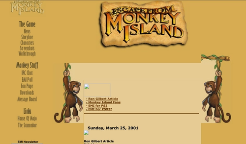 My love of the Monkey Island series of games led me to create escapefrommi.com back in 2001, a fan site for the Escape From Monkey Island game that was in the making at the time. This was written using a simple CMS I created using Perl CGI Scripts. This ran for two or three years, launch week grabbing a whopping 10,000 hits.